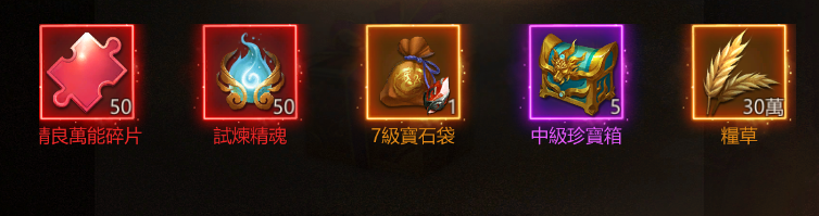 贈送:精良萬能碎片x50、試煉精魂x50、7級寶石袋x1、中級珍寶箱x5
