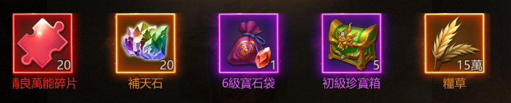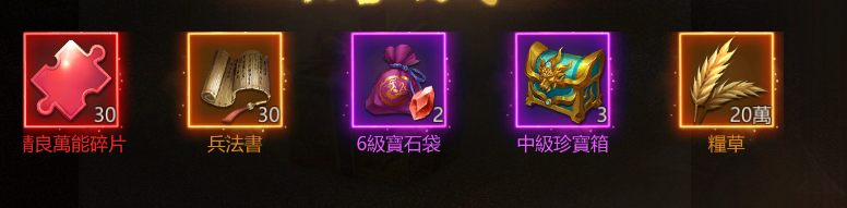 贈送:精良萬能碎片x30、兵法書x30、6級寶石袋x2、中級珍寶箱x3