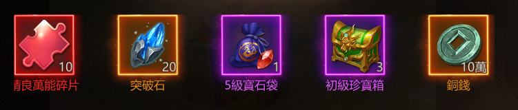 贈送:精良萬能碎片x10、突破石x20、5級寶石袋x1、初級珍寶箱x3