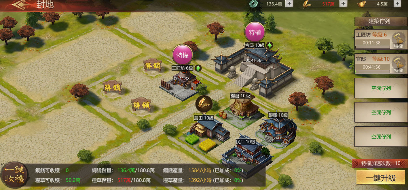 封地是主公養成資源的核心來源。封地以主殿為核心,提升主殿等級可逐步解鎖各類建築。
